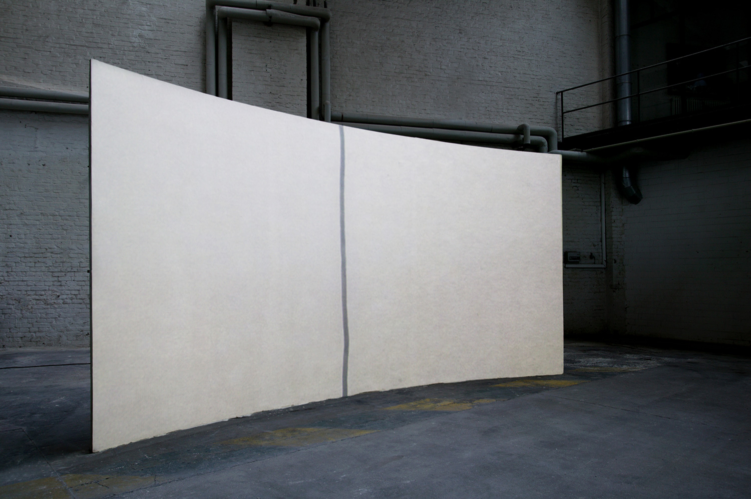 ‘I am breathing against the camera lens while filming a black line drawn onto grey card. The aspirate and condensation blur and finally make the line disappear. The condensation on the lens dries up shortly after and therefore the line reappears. I repeat the action several times. The video is being projected onto a fake concrete wall (concave) with the sound played aloud. The dimensions and the shape of the wall derive from the studio wall of the Museum of Modern Art in Dublin where I did an artist in residence in 2003/04.’